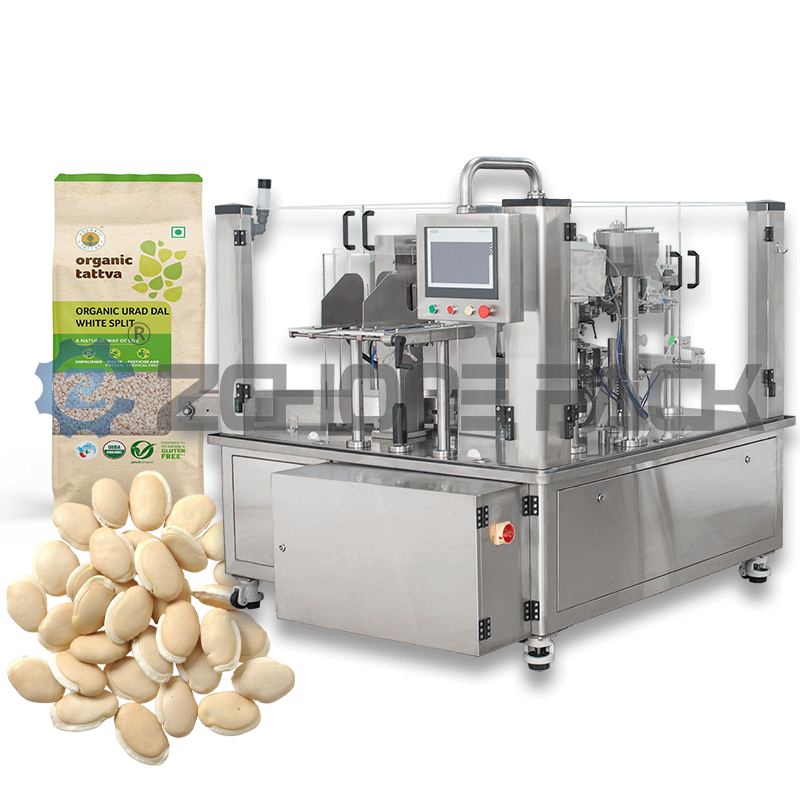 La máquina envasadora de ocho estaciones alimentada por bolsas para lentejas blancas es una máquina envasadora automática alimentada por bolsas diseñada específicamente para envasar lentejas blancas. Cuenta con ocho estaciones de trabajo (estaciones) para la operación de una línea de producción totalmente automatizada.